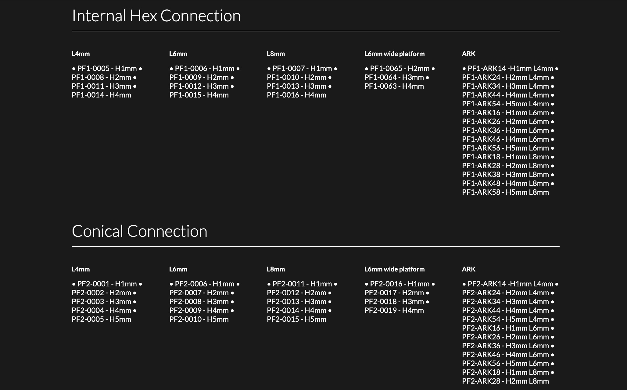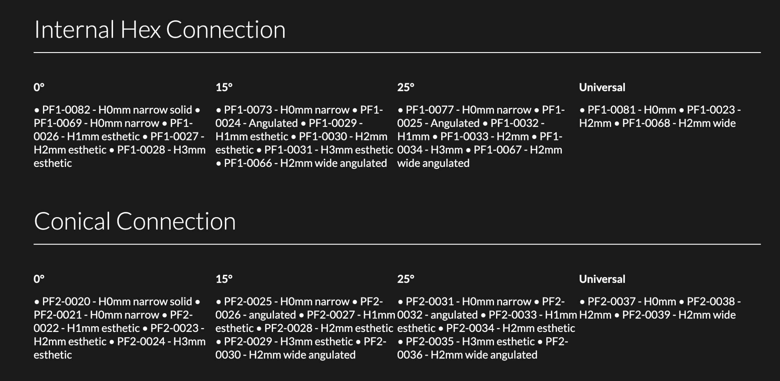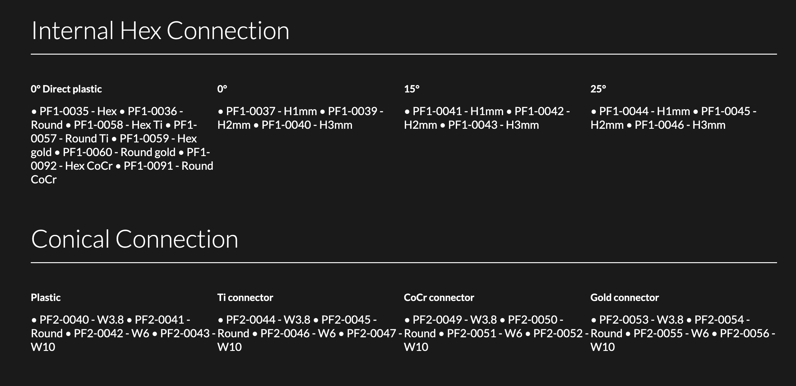 Our aesthetic burn-out abutments replicate our PEEK temporary abutment in an effort to keep the shape and aesthetics of the gum during the final treatment. The different gingiva range from 2 to 4 mm and are matched with different angles – 15⁰ & 25⁰, allowing clinicians to restore different cases, precisely and quickly.
